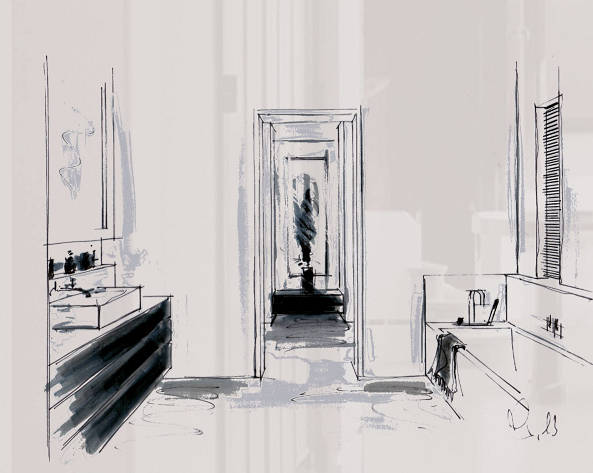 Blick aus dem Schlafraum in den Wasch- und Badbereich. Im hinteren separat schließbarenTeil, Dusche und WC.